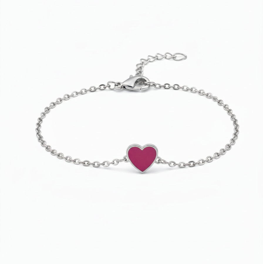 Sweet enamelled heart flexible chain bracelet for kids, handcrafted in pure 92.5 sterling silver with your choice of silver or 18k gold finish. Hypoallergenic and adjustable by half an inch for a perfect fit.