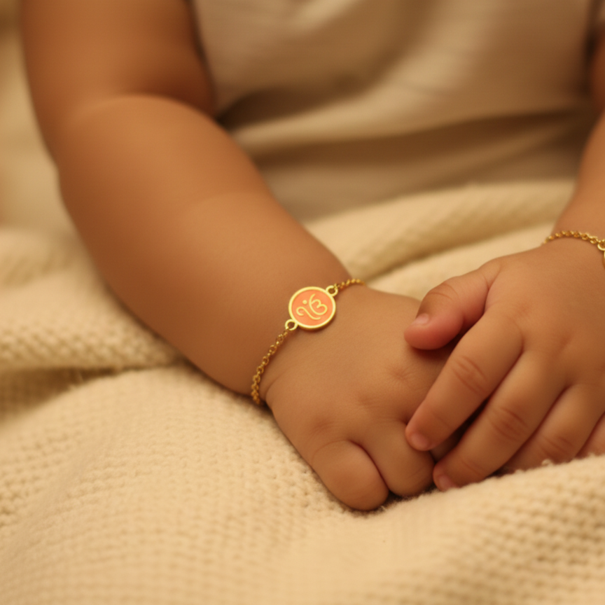 Cool enamelled Ik onkar flexible chain bracelet for kids, handcrafted in pure 92.5 sterling silver with your choice of silver or 18k gold finish. Hypoallergenic and adjustable by half an inch for a perfect fit.