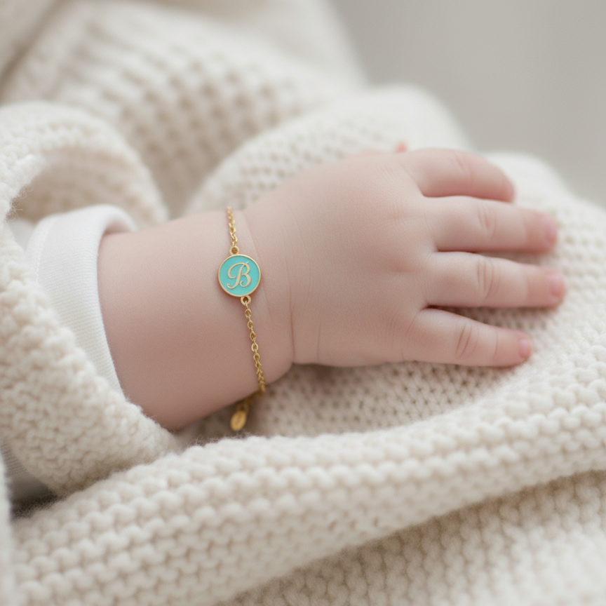 "Personalized blue initial enamelled chain bracelet for kids, crafted in pure 92.5% silver with an 18k gold finish. Flexible, handcrafted with love, and hypoallergenic for delicate skin!"
