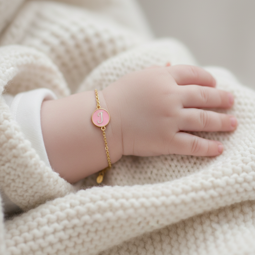 Personalised pink enamelled initial flexible chain bracelet for kids, handcrafted in pure 92.5 sterling silver with your choice of silver or 18k gold finish. Hypoallergenic and adjustable by half an inch for a perfect fit.