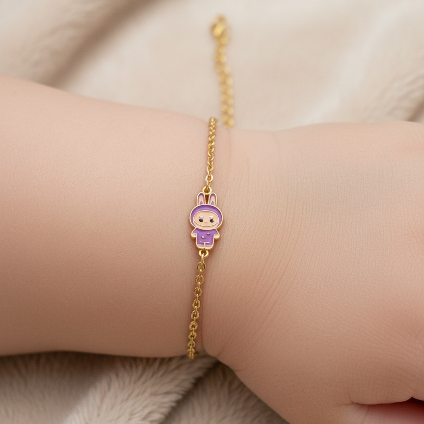 Trendy purple enamelled Labubu flexible chain bracelet for kids, handcrafted in pure 92.5 sterling silver with your choice of silver or 18k gold finish. Hypoallergenic and adjustable by half an inch for a perfect fit.