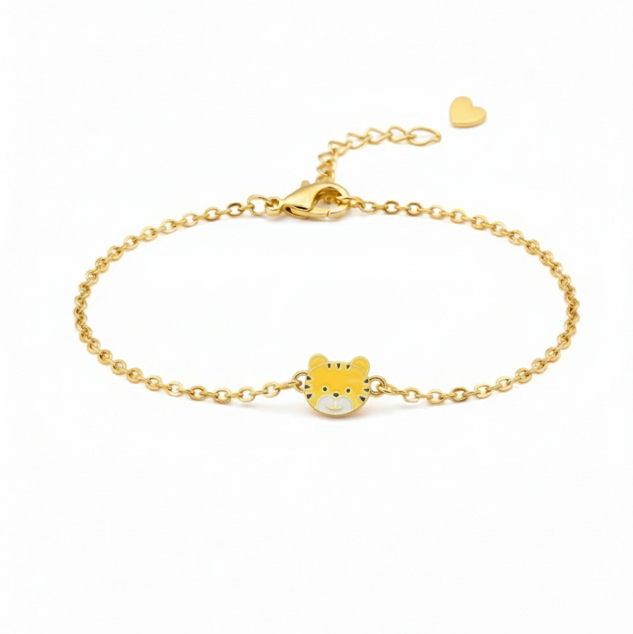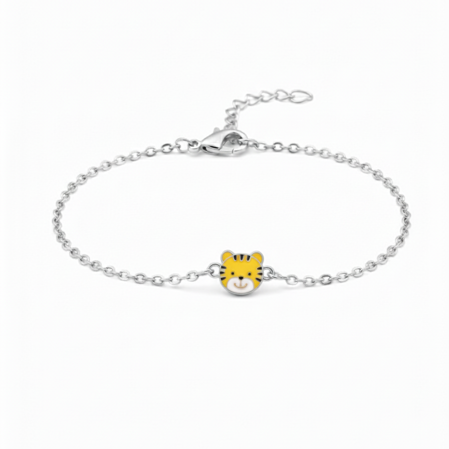 Cool enamelled lion flexible chain bracelet for kids, handcrafted in pure 92.5 sterling silver with your choice of silver or 18k gold finish. Hypoallergenic and adjustable by half an inch for a perfect fit.