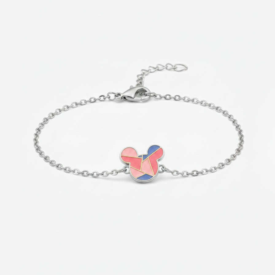 Playful enamelled Mickey flexible chain bracelet for kids, handcrafted in pure 92.5 sterling silver with your choice of silver or 18k gold finish. Hypoallergenic and adjustable by half an inch for a perfect fit.