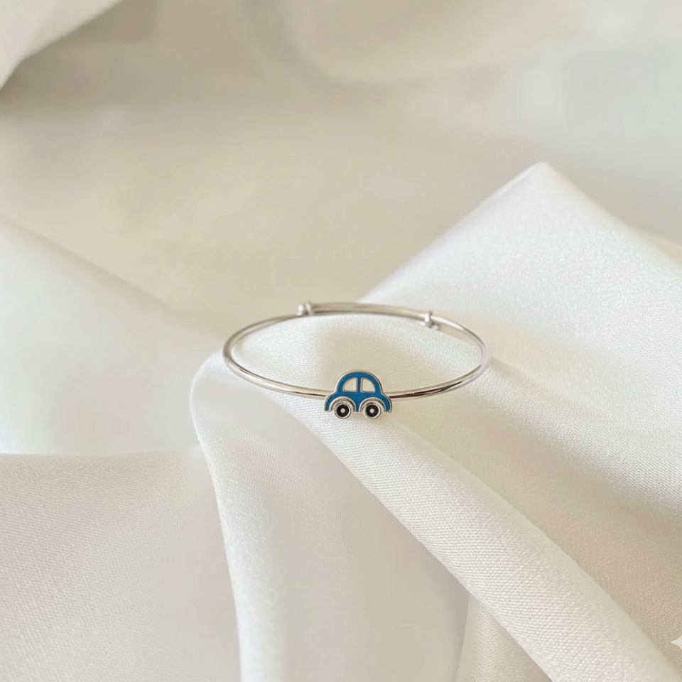 This Car Silver adjustable kids' bangle is made from 92.5 sterling silver and beautifully finished with 18k gold. Designed for durability and comfort, it’s adjustable to fit children up to 5 years old, adding a joyful touch to any outfit.