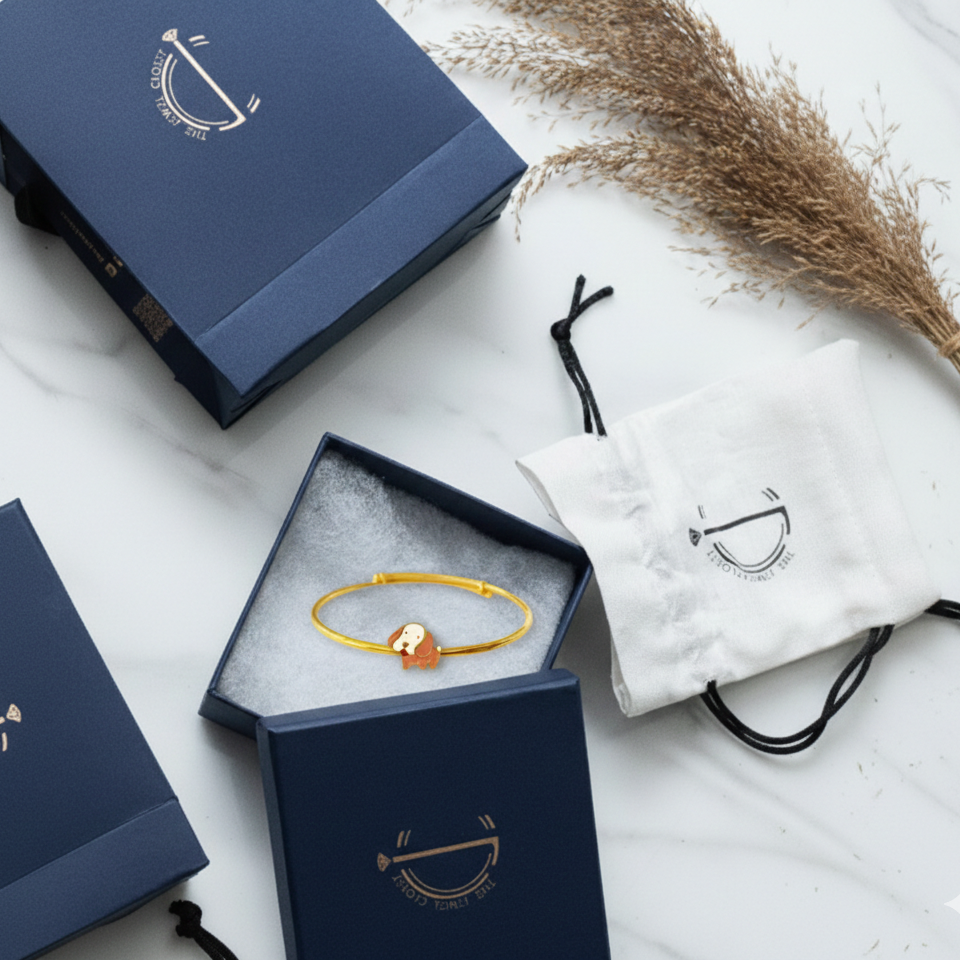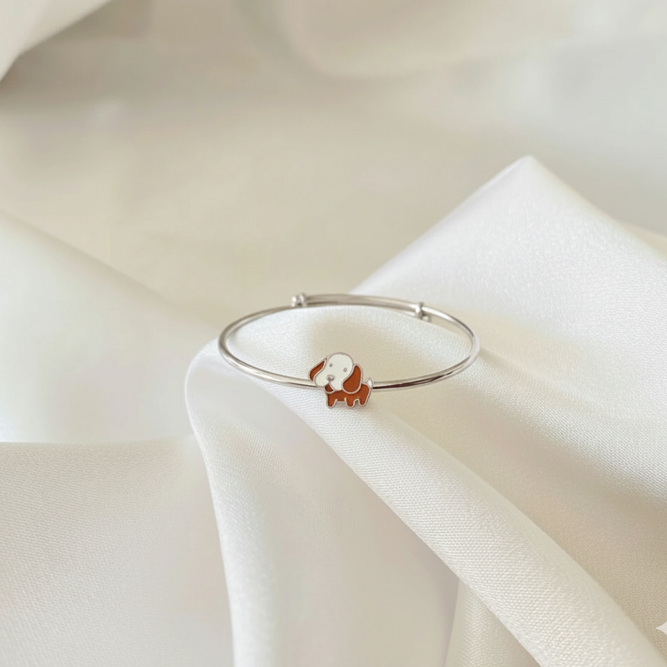 This Dog Silver adjustable kids' bangle is made from 92.5 sterling silver and beautifully finished with 18k gold. Designed for durability and comfort, it’s adjustable to fit children up to 5 years old, adding a joyful touch to any outfit.