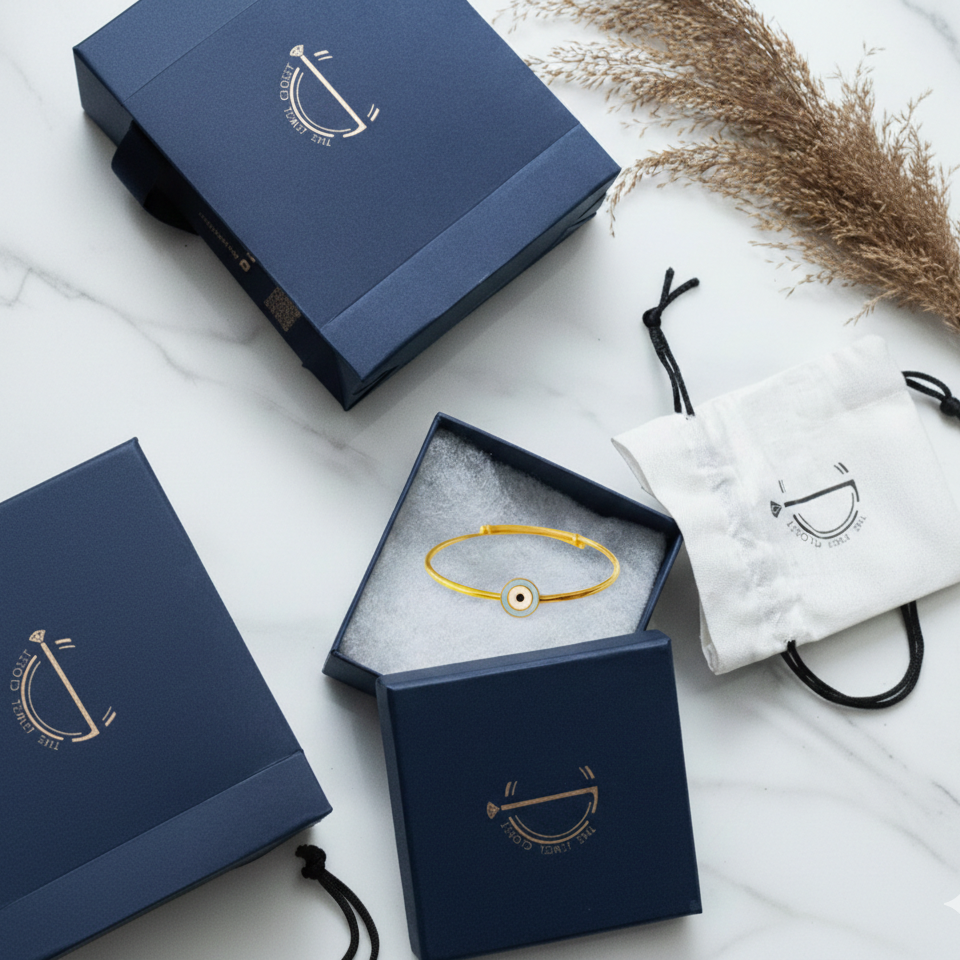 This Evil eye Silver adjustable kids' bangle is made from 92.5 sterling silver. Designed for durability and comfort, it’s adjustable to fit children up to 5 years old, adding a joyful touch to any outfit.