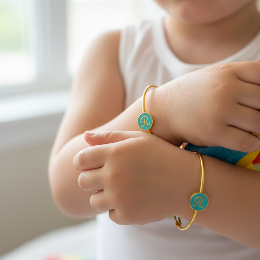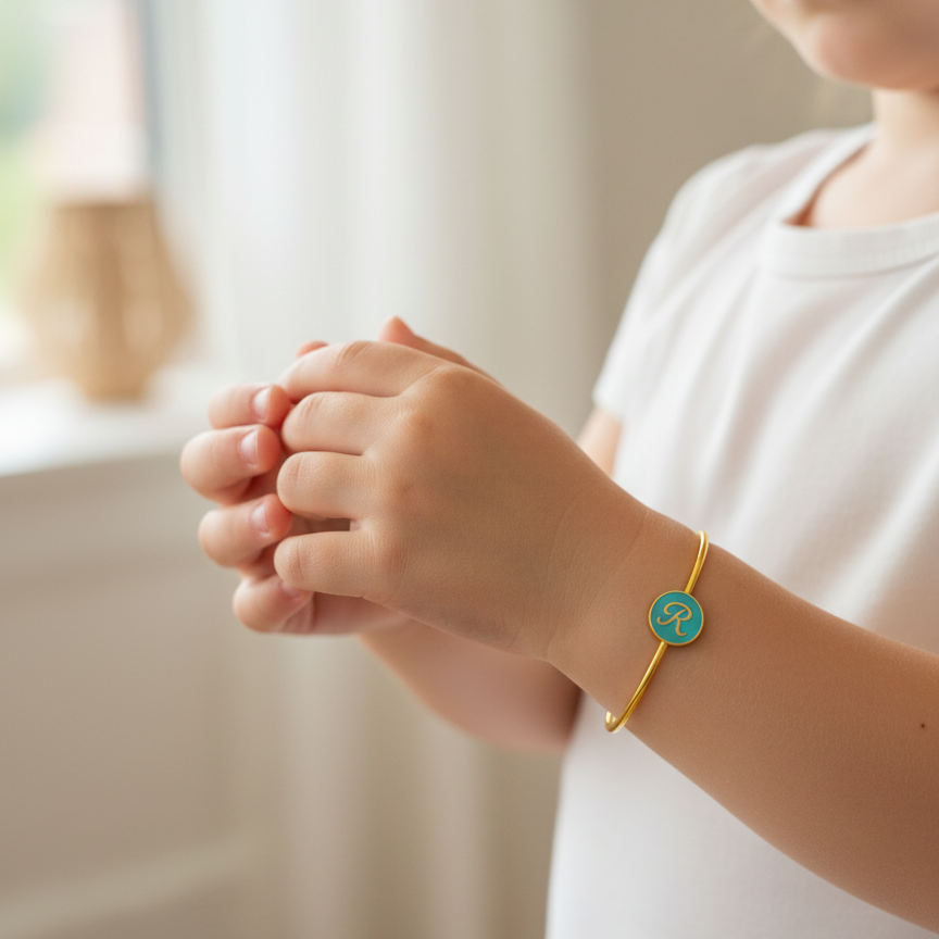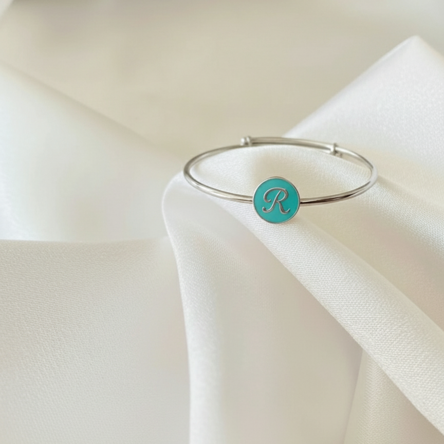 This initial blue Silver adjustable kids' bangle is made from 92.5 sterling silver and beautifully finished with 18k gold. Designed for durability and comfort, it’s adjustable to fit children up to 5 years old, adding a joyful touch to any outfit.
