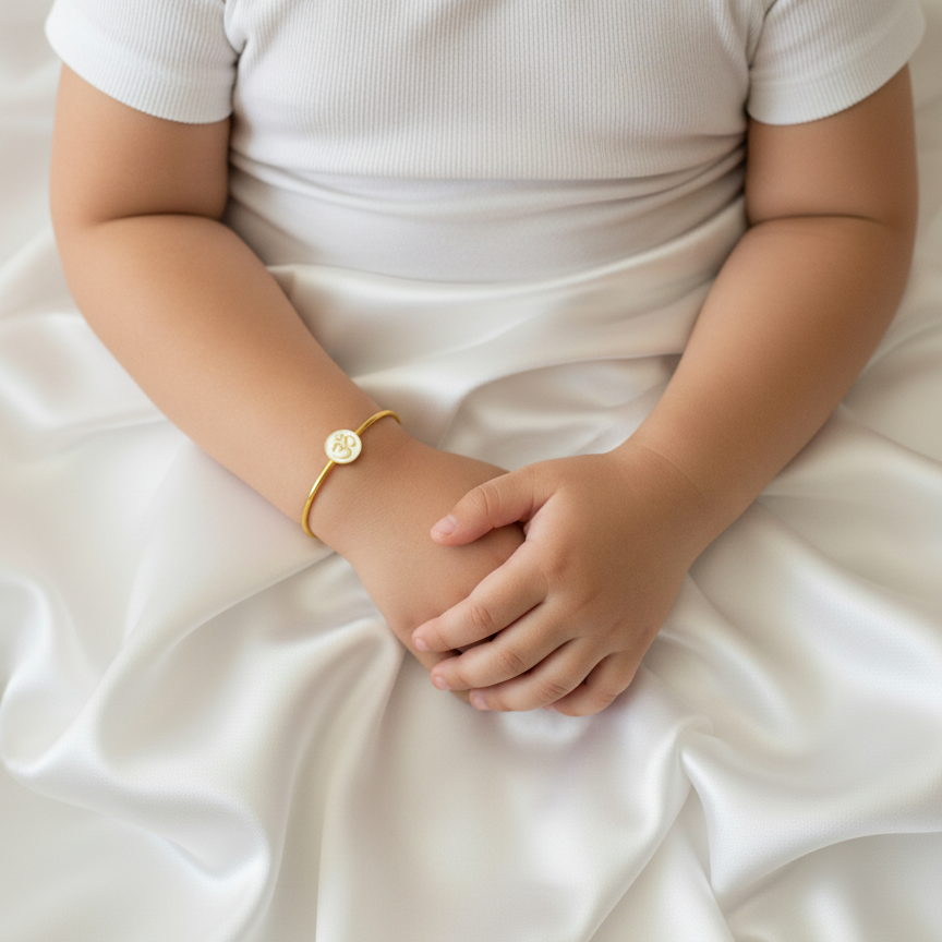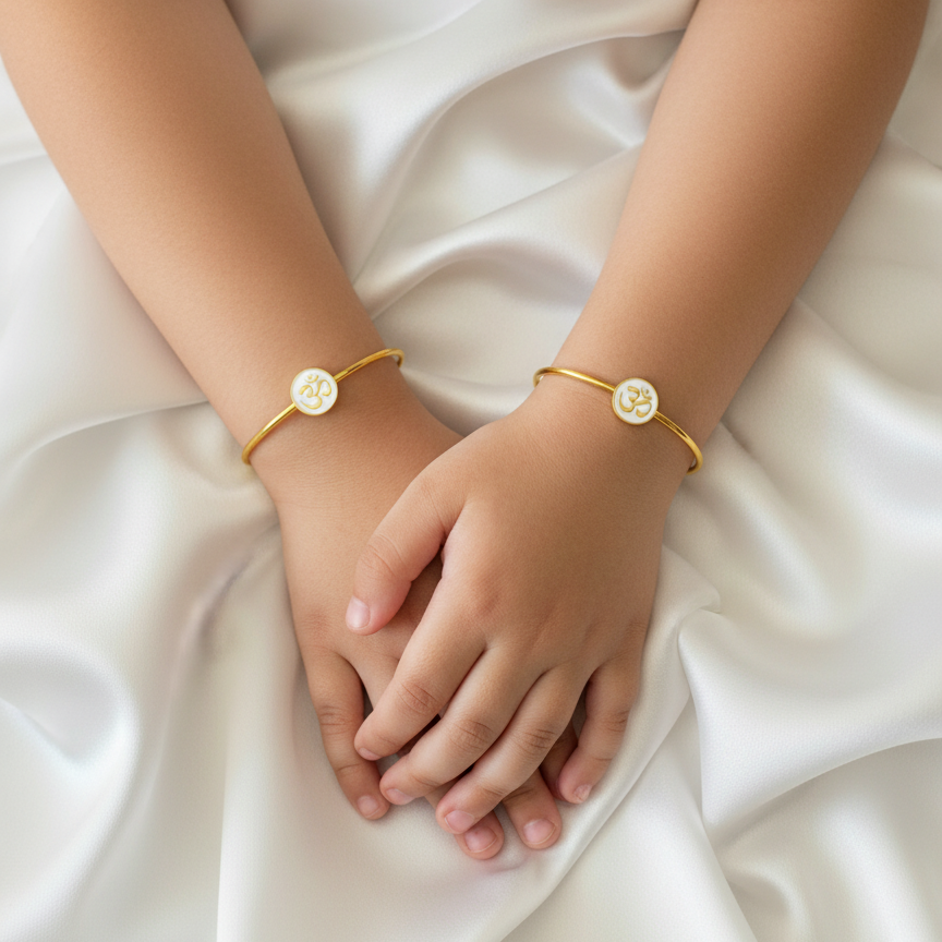 This om enamel white Silver adjustable kids' bangle is made from 92.5 sterling silver and beautifully finished with 18k gold. Designed for durability and comfort, it’s adjustable to fit children up to 5 years old, adding a joyful touch to any outfit.