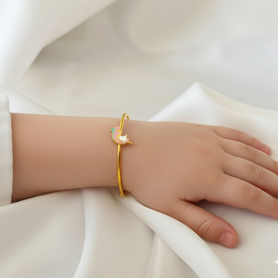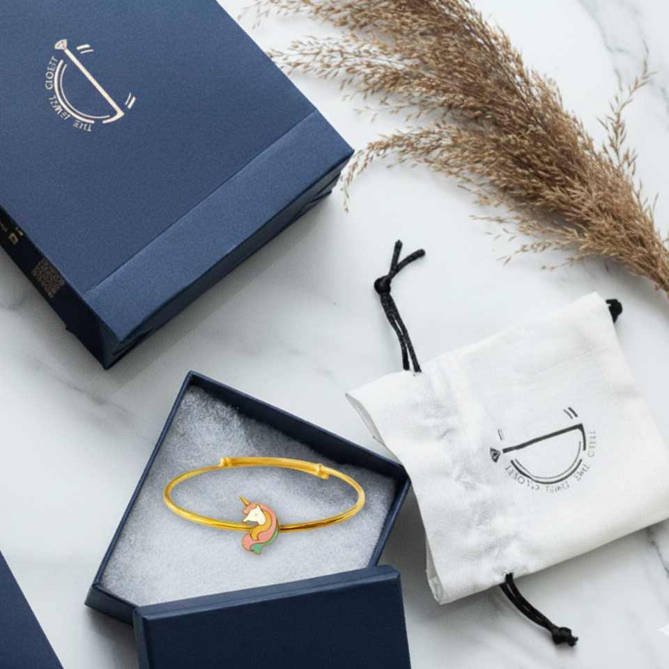 This Unicorn Silver adjustable kids' bangle is made from 92.5 sterling silver and beautifully finished with 18k gold. Designed for durability and comfort, it’s adjustable to fit children up to 5 years old, adding a joyful touch to any outfit.
