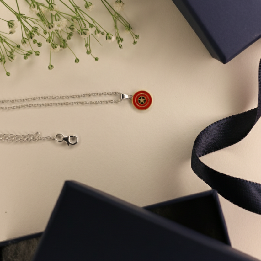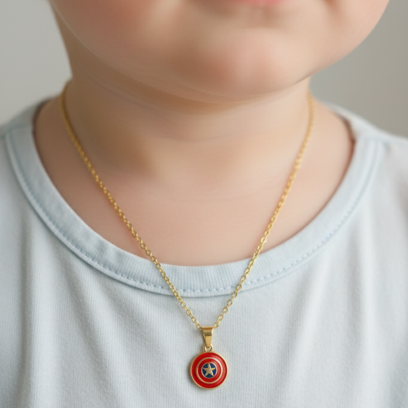 Heroic enamelled Captain America necklace for kids, handcrafted in pure 92.5 sterling silver with a premium 18k gold finish. Hypoallergenic and perfect for everyday style. Pair it with matching ear studs from our collection for a complete look.