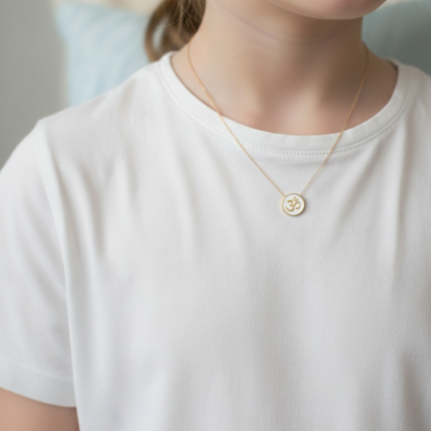 Elegant white enamelled Om necklace for kids, handcrafted in pure 92.5 sterling silver with a luxurious 18k gold finish. Hypoallergenic and perfect for everyday blessings. Pair it with matching ear studs from our collection for a complete look.