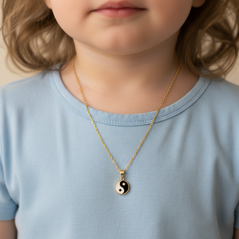 Stylish enamelled Yin Yang necklace for kids, handcrafted in pure 92.5 sterling silver with an elegant 18k gold finish. Hypoallergenic and perfect for everyday wear. Pair it with matching ear studs from our collection for a complete look.