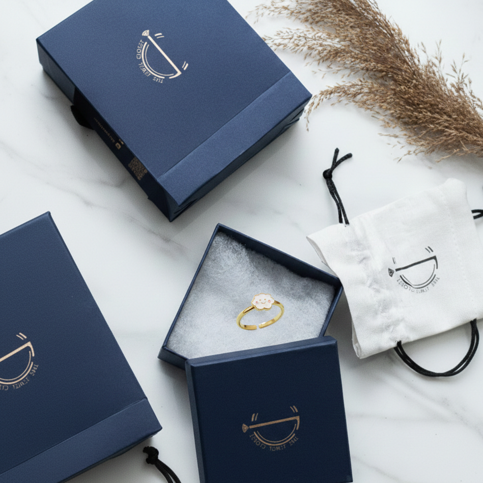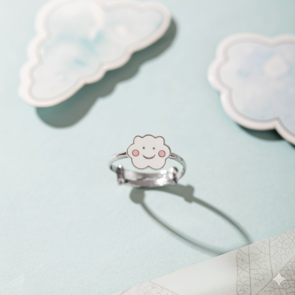 "Whimsical cloud enamelled rings for kids, made in pure 92.5% silver with an 18k gold finish. Handcrafted with love and hypoallergenic for delicate skin!"