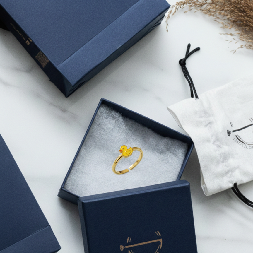 "Adorable duck enamelled rings for kids, crafted in pure 92.5% silver with an 18k gold finish. Handcrafted with love and hypoallergenic for delicate skin!"