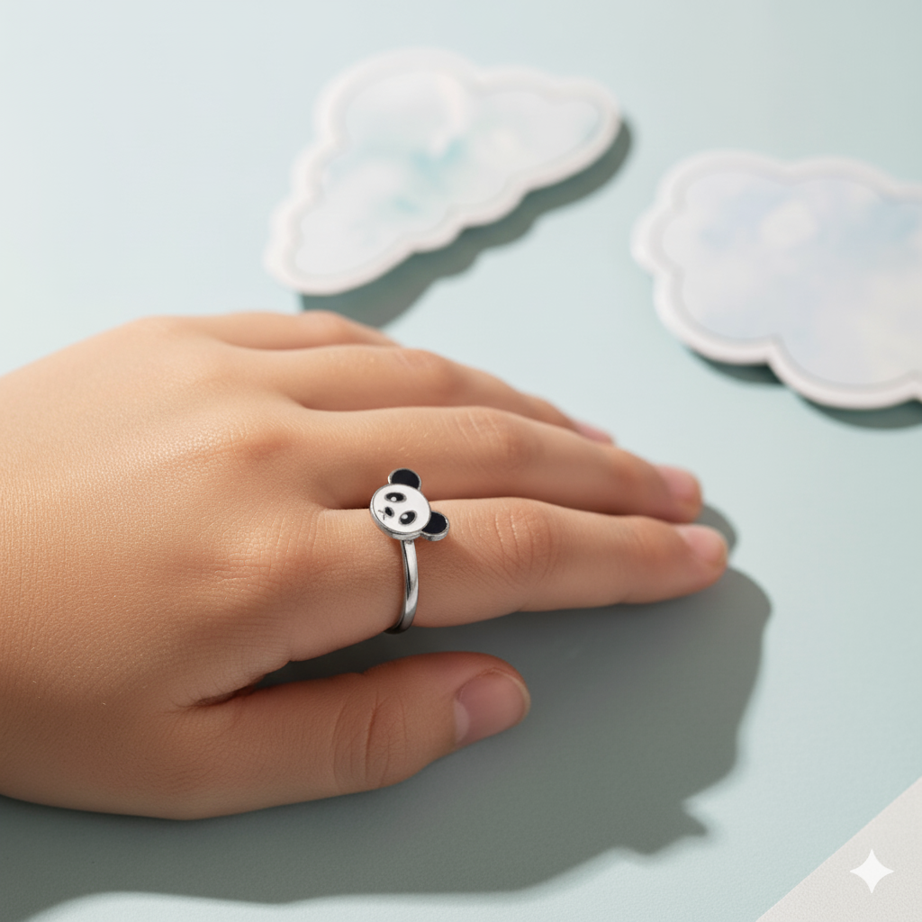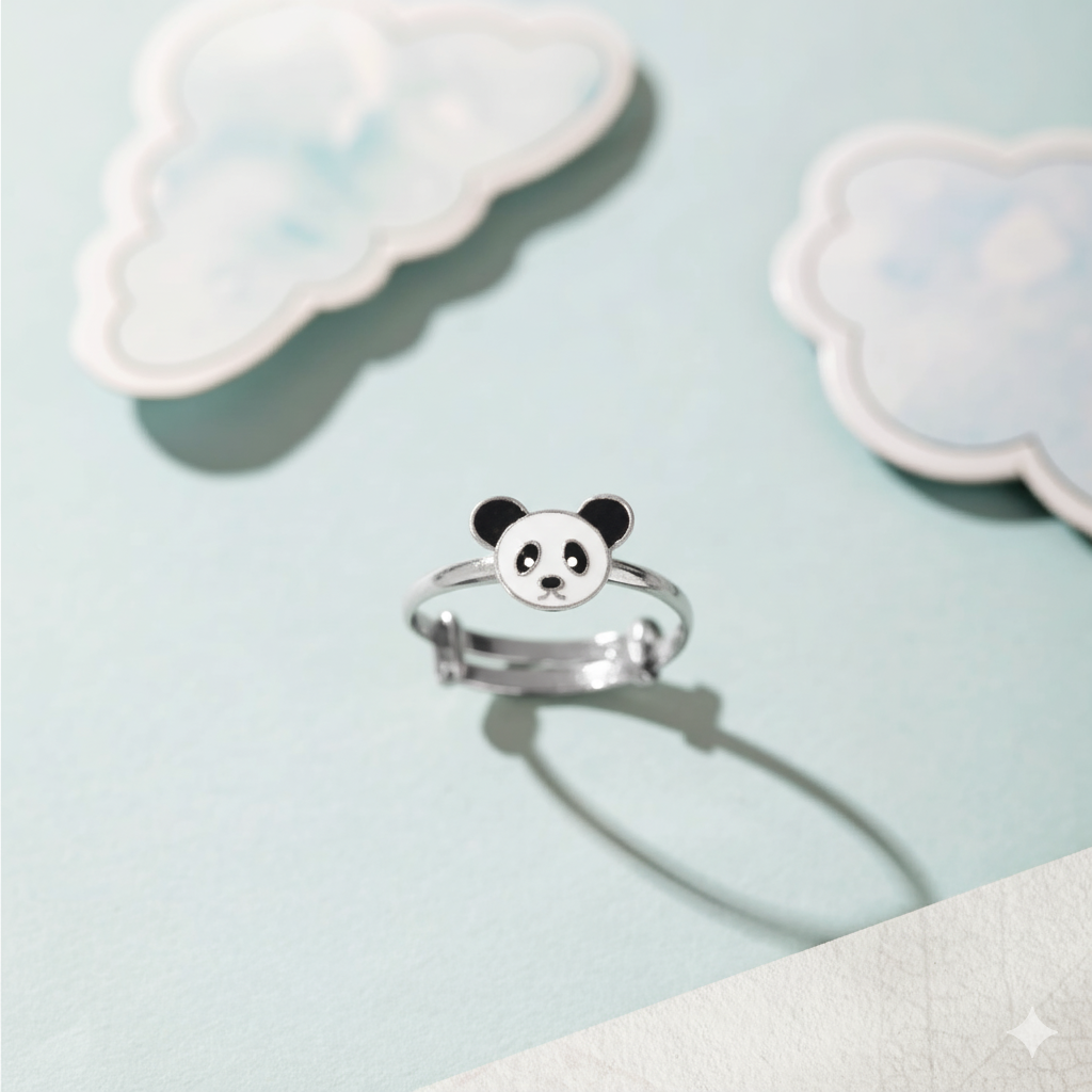 "Adorable panda enamelled rings for kids, crafted in pure 92.5% silver with an 18k gold finish. Handcrafted with love and hypoallergenic for delicate skin!"