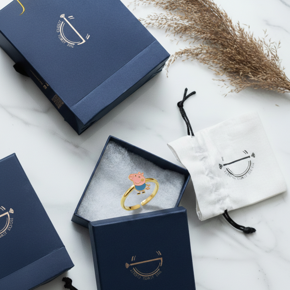"Playful Peppa Pig enamelled rings for kids, crafted in pure 92.5% silver with an 18k gold finish. Handcrafted with love and hypoallergenic for delicate skin!"