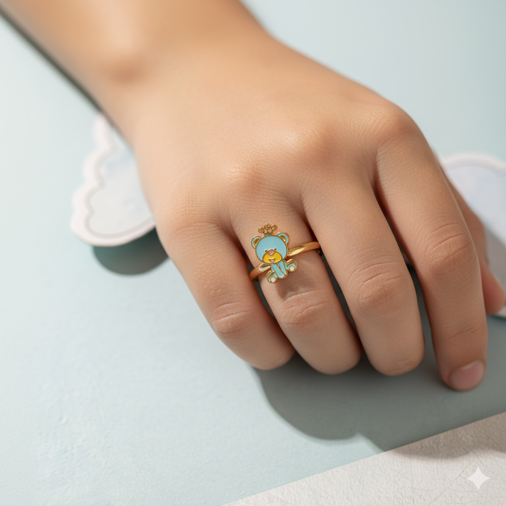 "Cute teddy enamelled rings for kids, crafted in pure 92.5% silver with an 18k gold finish. Handcrafted with love and hypoallergenic for delicate skin!"