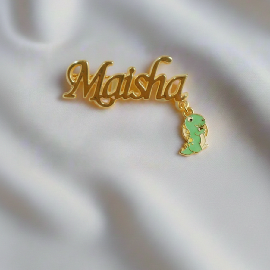 "Adorable Customized name dinosour 92.5 silver brooch for kids, made in pure 92.5% silver with an 18k gold finish. Handcrafted with love and hypoallergenic for little ones!