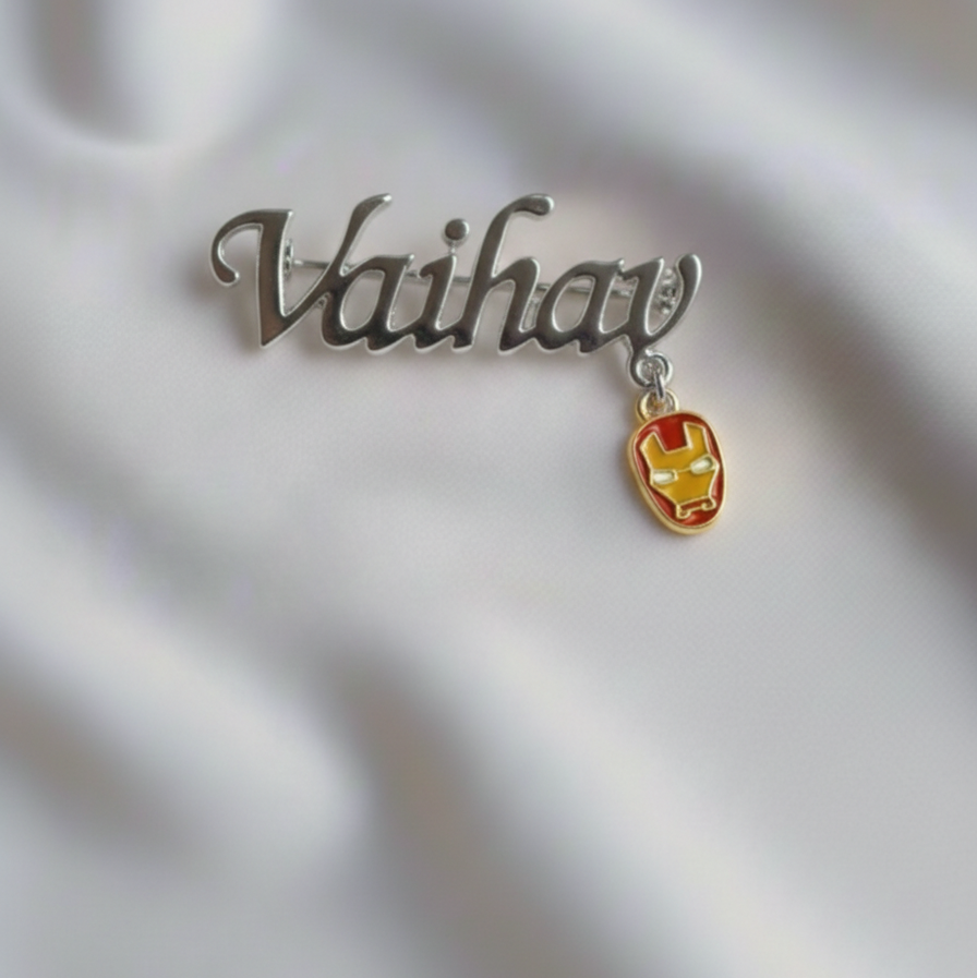 "Adorable Customized name ironman 92.5 silver brooch for kids, made in pure 92.5% silver with an 18k gold finish. Handcrafted with love and hypoallergenic for little ones!