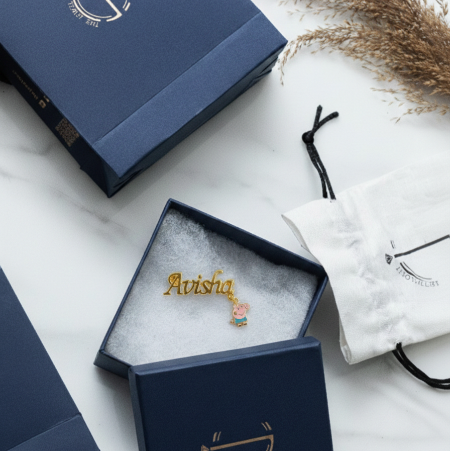 "Adorable Customized name peppa pig 92.5 silver brooch for kids, made in pure 92.5% silver with an 18k gold finish. Handcrafted with love and hypoallergenic for little ones!