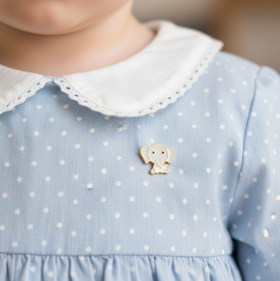 "Charming elephant enamelled lapel pin for kids, made in pure 92.5% silver with an 18k gold finish. Handcrafted with love and hypoallergenic for delicate skin!"