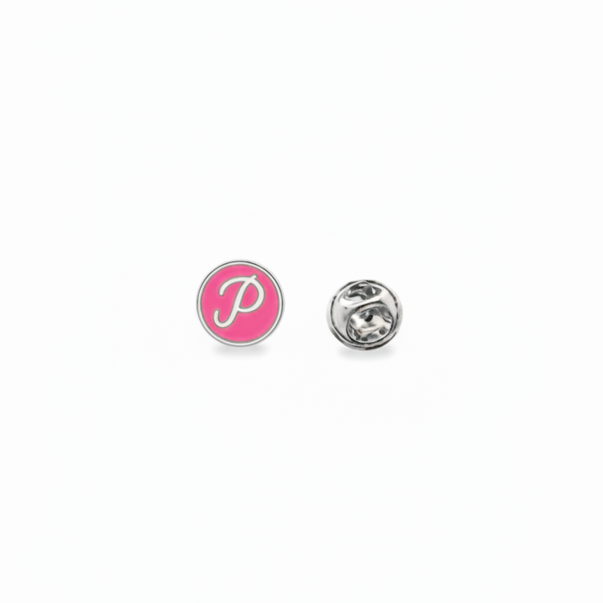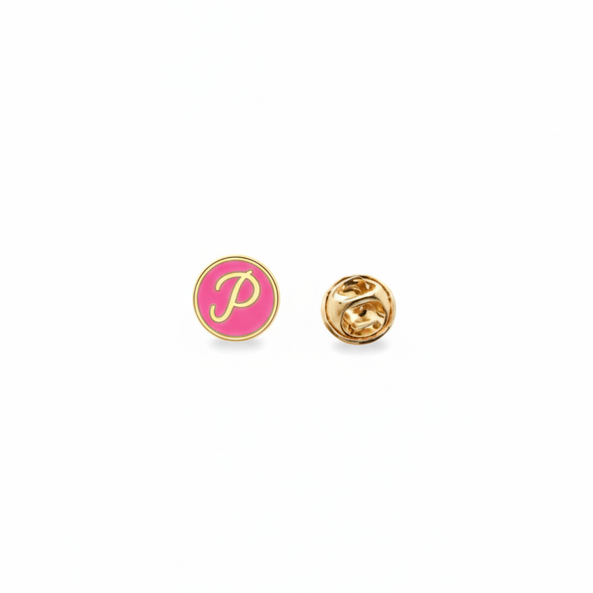 "Charming pink initial enamelled lapel pin for kids, made in pure 92.5% silver with an 18k gold finish. Handcrafted with love and hypoallergenic for delicate skin!"