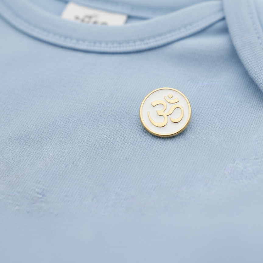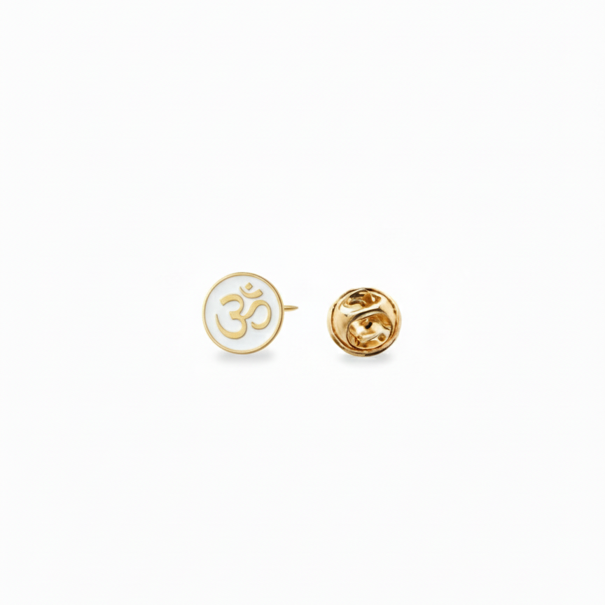 "Elegant white Om enamelled lapel pin for kids, made in pure 92.5% silver with an 18k gold finish. Handcrafted with love and hypoallergenic for delicate skin!"