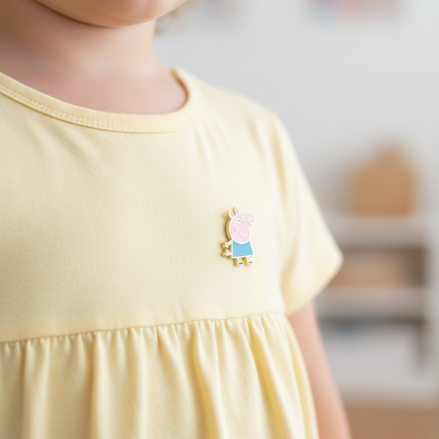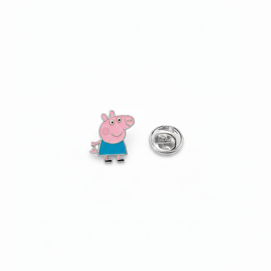 "Playful Peppa Pig enamelled lapel pin for kids, made in pure 92.5% silver with an 18k gold finish. Handcrafted with love and hypoallergenic for delicate skin!"