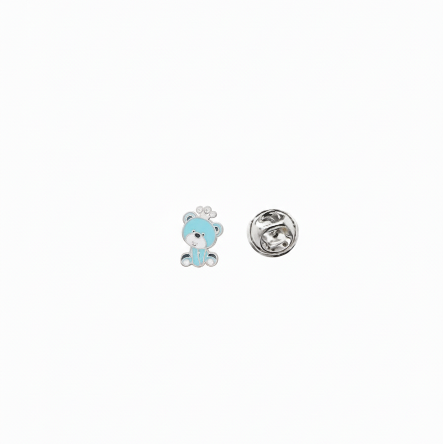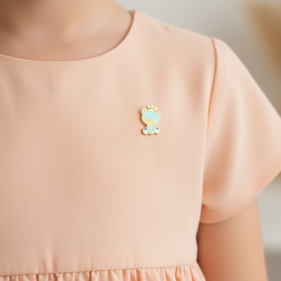 "Cute teddy enamelled lapel pin for kids, crafted in pure 92.5% silver with an 18k gold finish. Handcrafted with love and hypoallergenic for little ones!"