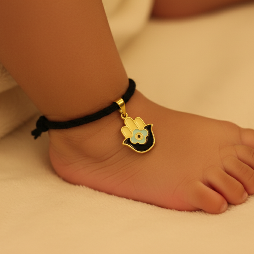 Protective, stylish, and handcrafted with love! Made in 92.5% pure silver with 18K gold plating, this Hamsa Nazarbattu is hypoallergenic and adjustable for your little one’s comfort and safety.