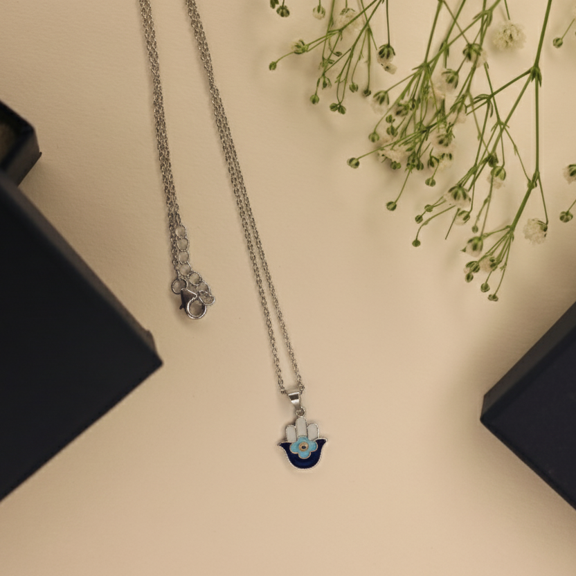 Elegant enamelled Hamsa necklace for kids, handcrafted in pure 92.5 sterling silver with a refined 18k gold finish. Hypoallergenic and perfect for everyday protection. Pair it with matching ear studs from our collection for a complete look.