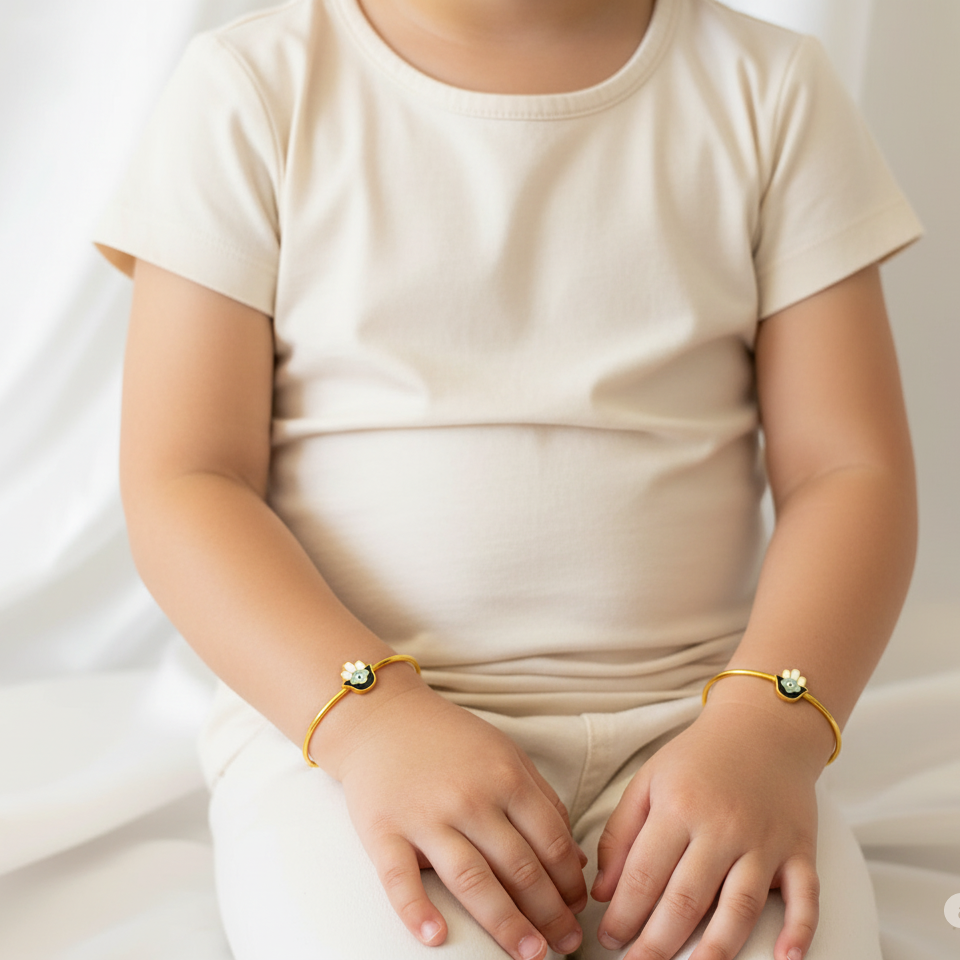 This Hamsa Silver adjustable kids' bangle is made from 92.5 sterling silver and beautifully finished with 18k gold. Designed for durability and comfort, it’s adjustable to fit children up to 5 years old, adding a joyful touch to any outfit.