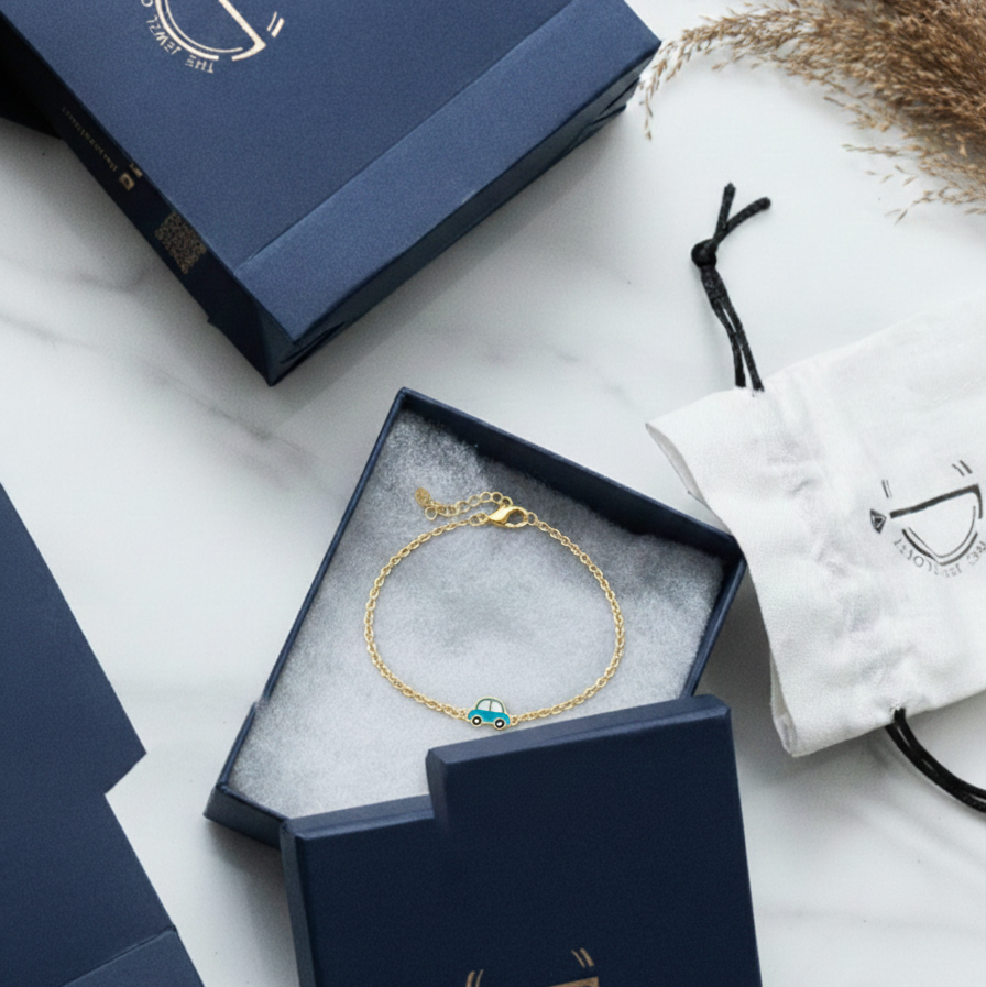 Fun enamelled car flexible chain bracelet for kids, handcrafted in pure 92.5 sterling silver with your choice of silver or 18k gold finish. Hypoallergenic and adjustable by half an inch for a comfortable fit.