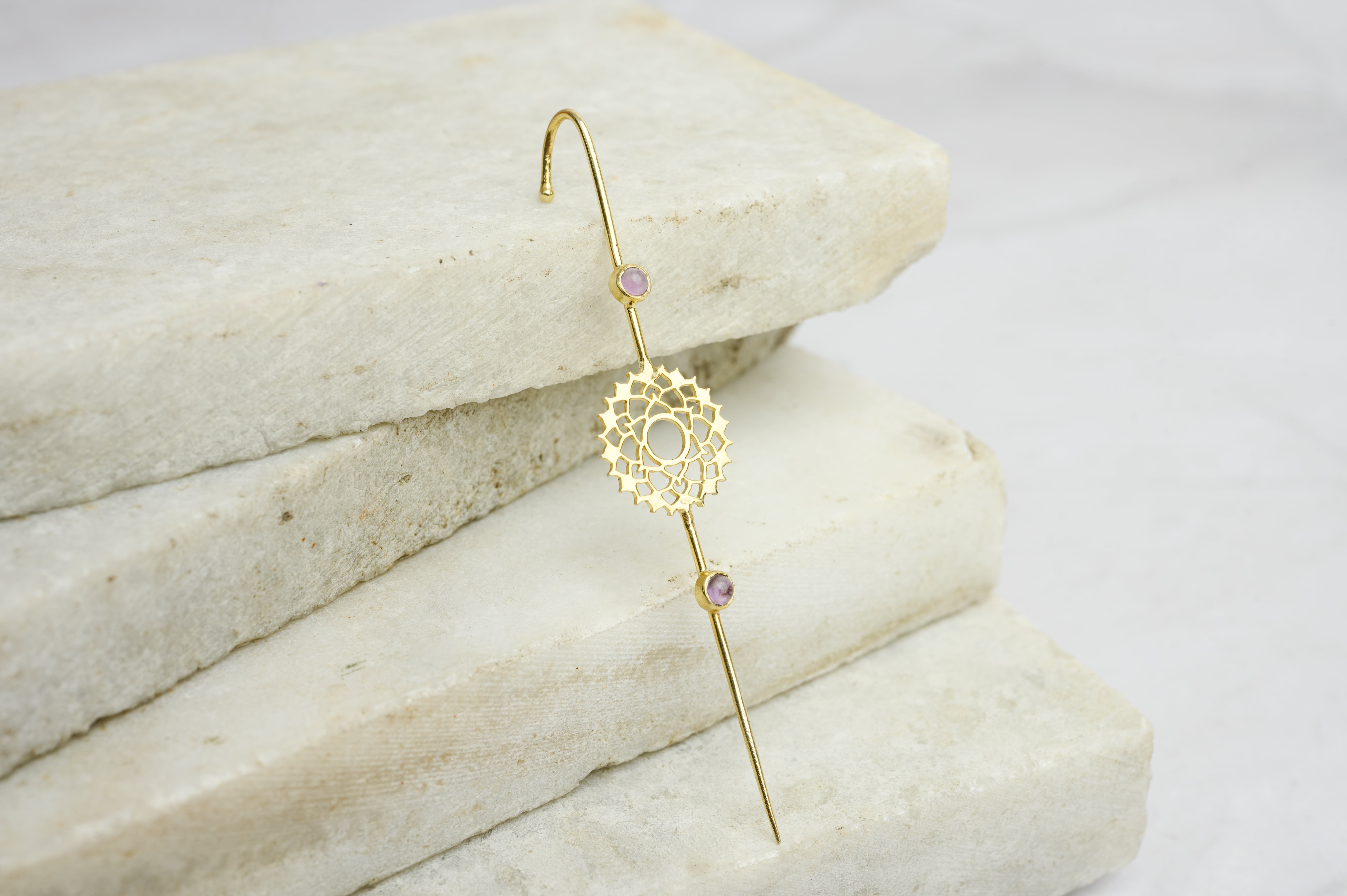 Enhance your spiritual journey with our exquisite Crown Chakra Ear Pin crafted in 92.5% silver and adorned with a mesmerizing amethyst stone. Each piece features delicate 18k gold plating, adding a touch of luxury to your spiritual adornment. Elevate your style and energy alignment with this elegant accessory.
