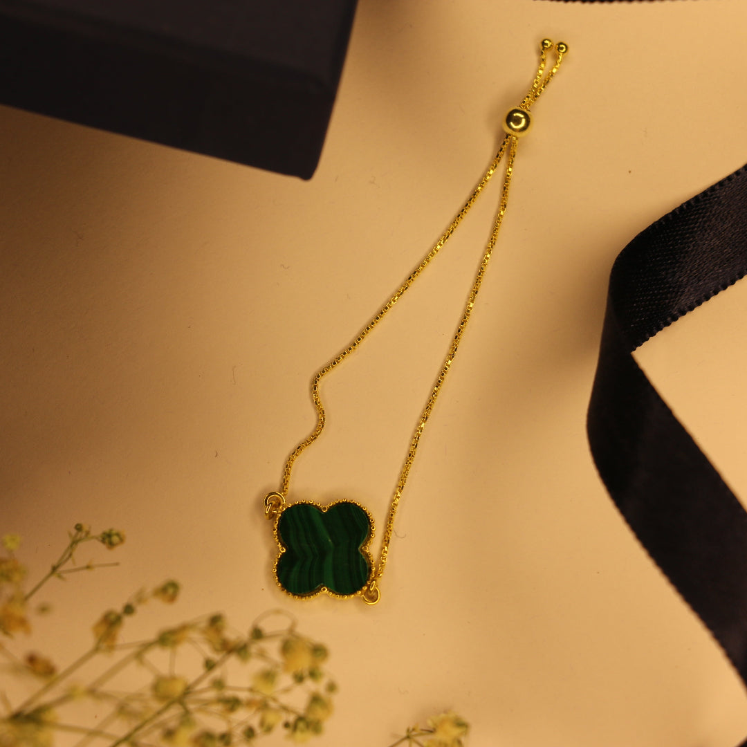 Discover the allure of our Malachite Clover Charm Slider Bracelet, skillfully fashioned from 92.5% pure silver and enhanced with a lavish 18k gold plating. This bracelet showcases a captivating clover charm adorned with the rich green hues of malachite, symbolizing luck and harmony. Elevate your elegance with this unique piece, a charming addition to your jewelry collection.