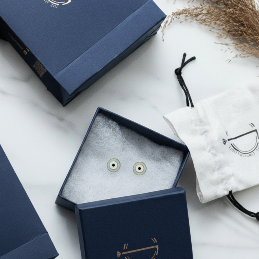 Stylish enamelled evil eye ear studs for girls, handcrafted in pure 92.5 sterling silver with a radiant 18k gold finish. Hypoallergenic and perfect for everyday protection and charm.