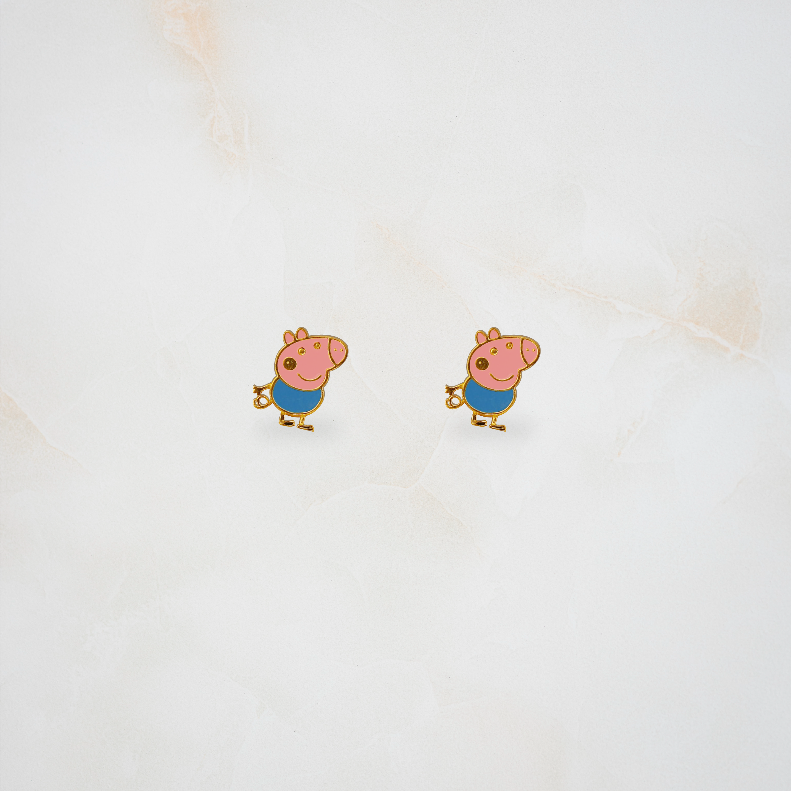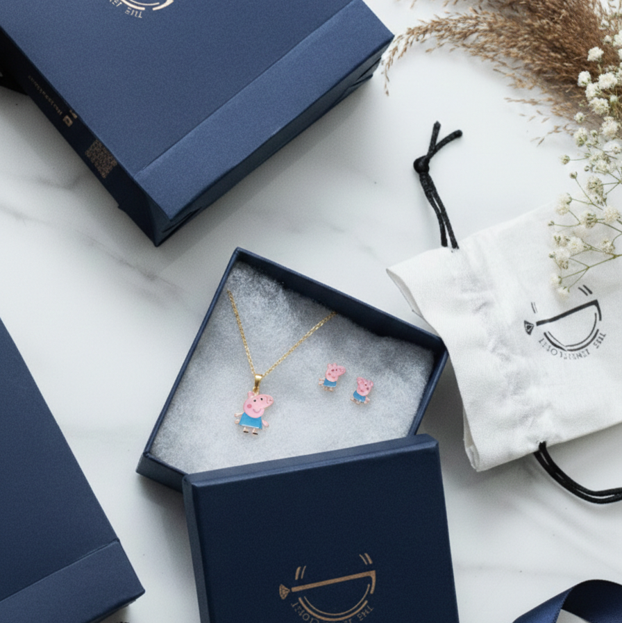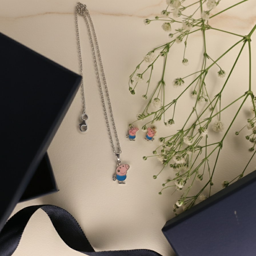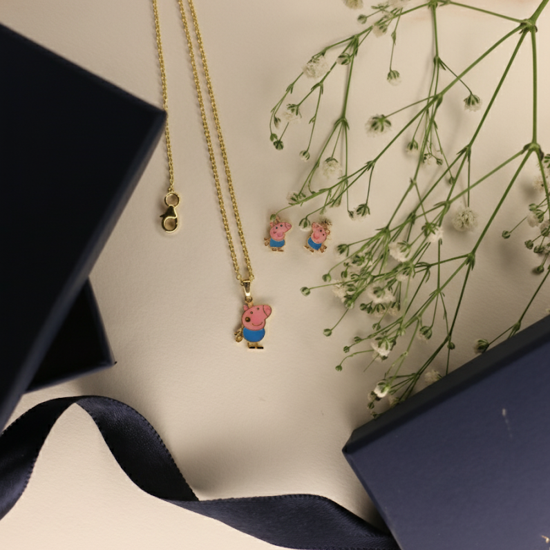 "Playful Peppa Pig enamelled necklace set for kids, made in pure 92.5% silver with an 18k gold finish. Handcrafted with love and hypoallergenic for delicate skin!"