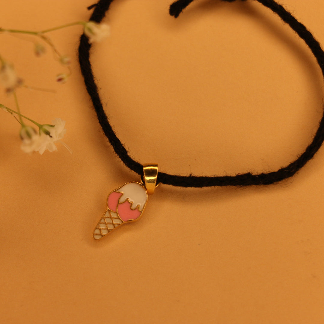 Introducing the Softy Kids Black Thread Nazarbattu, a sweet and delightful piece of jewelry designed to add a touch of whimsy and joy to your little ones' style. This delightful accessory is meticulously crafted using high-quality materials. The pendant features intricate enameling, showcasing a playful ice cream cone design that will capture the imagination of children and evoke a sense of happiness.