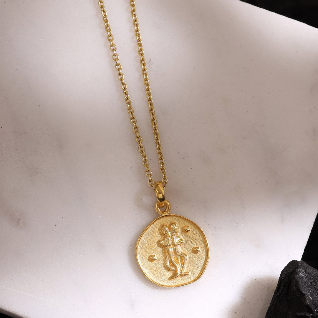 This simple yet elegant gold zodiac coin necklace reflects your inner-personality by wearing your magical star sign constellation. Wear solo for a casual and trendy look or combined with other sparkles for a more chic look.